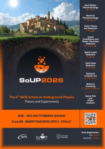 La 4ª edición de la escuela «School on Underground Physics: Theory and experiments» (SoUP2026) está dirigida a estudiantes de doctorado, posdoctorados y jóvenes investigadores involucrados en el campo de la Física Subterránea: Neutrinos, Materia Oscura y otras búsquedas de eventos raros. Este año, la Escuela, organizada por INFN-Bolonia, tendrá lugar del 26 al 30 de octubre de 2026 en el CeUB de Bertinoro (FC, Italia), un pequeño pueblo medieval a 60 km de Bolonia. La Escuela consta de conferencias y una sesión práctica de Estadística. También incluye una charla rápida, donde los participantes pueden presentarse brevemente, una sesión de pósteres para presentar sus investigaciones actuales y un evento de divulgación para el público general.